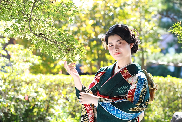深緑のお色と鮮やかなお華の柄が入った素敵なお振袖をお召しになったお嬢様のお写真です!