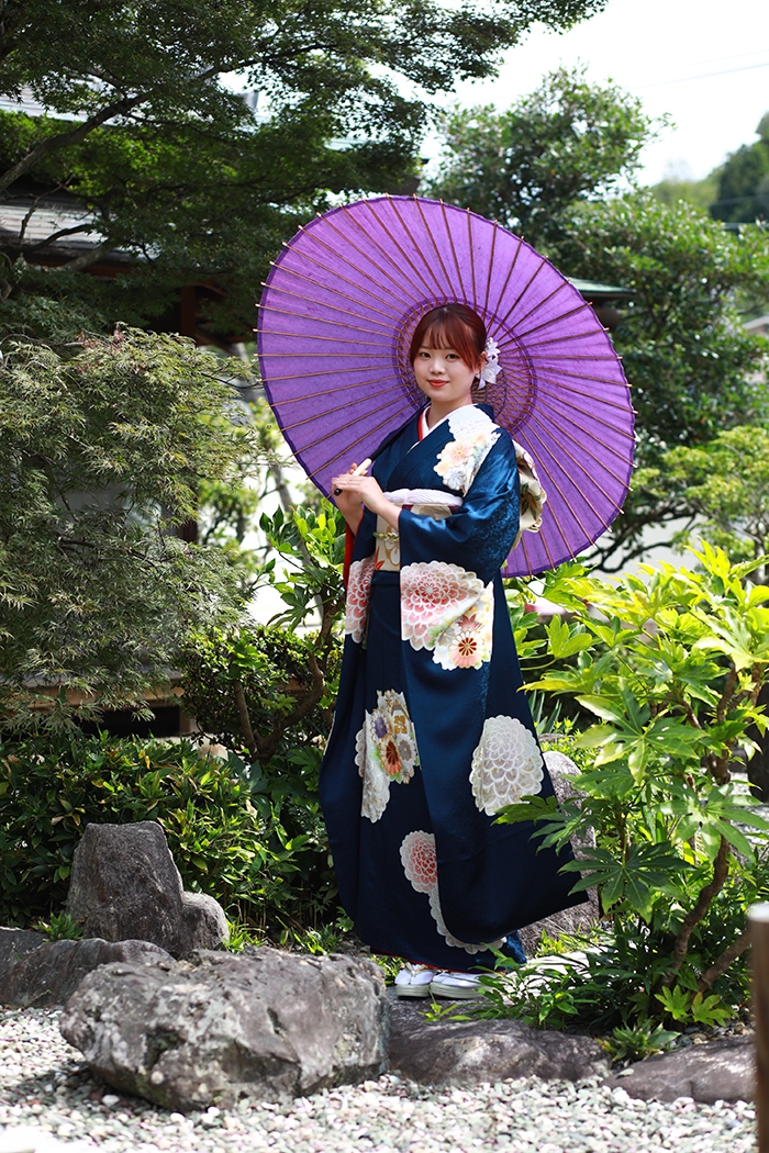 藍色をベースとした大輪の白いお花の素敵なお振袖は、お嬢様の気品をさらに引き立てています。