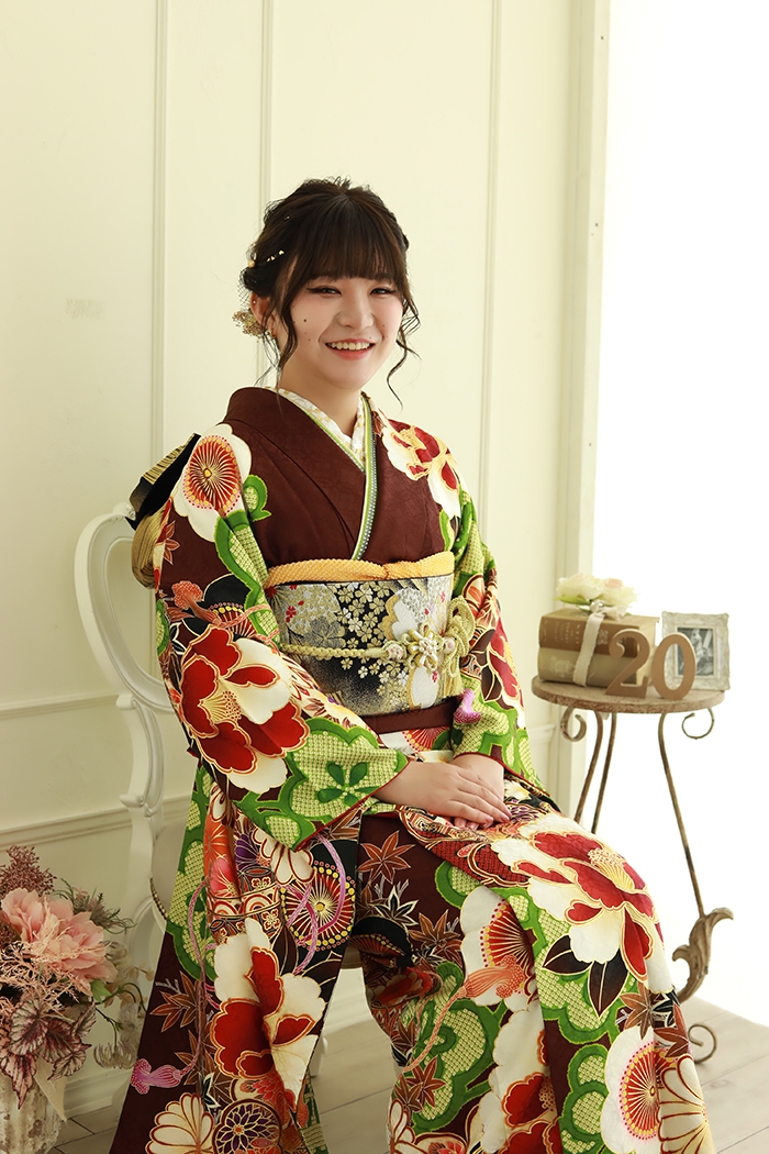 落ち着いた茜色のお振袖に映える大輪の花が特徴の艶やかなお姿のお嬢様です!