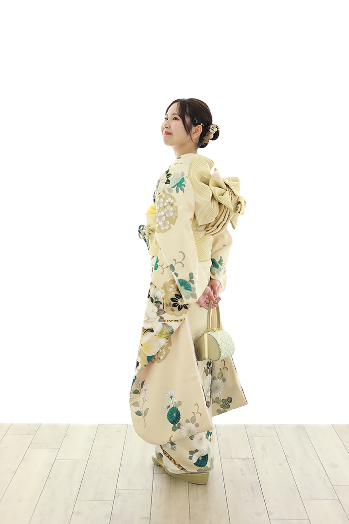 ホワイトカラーのお振袖とクリーム色の帯がとても素敵なお嬢様のお写真です!