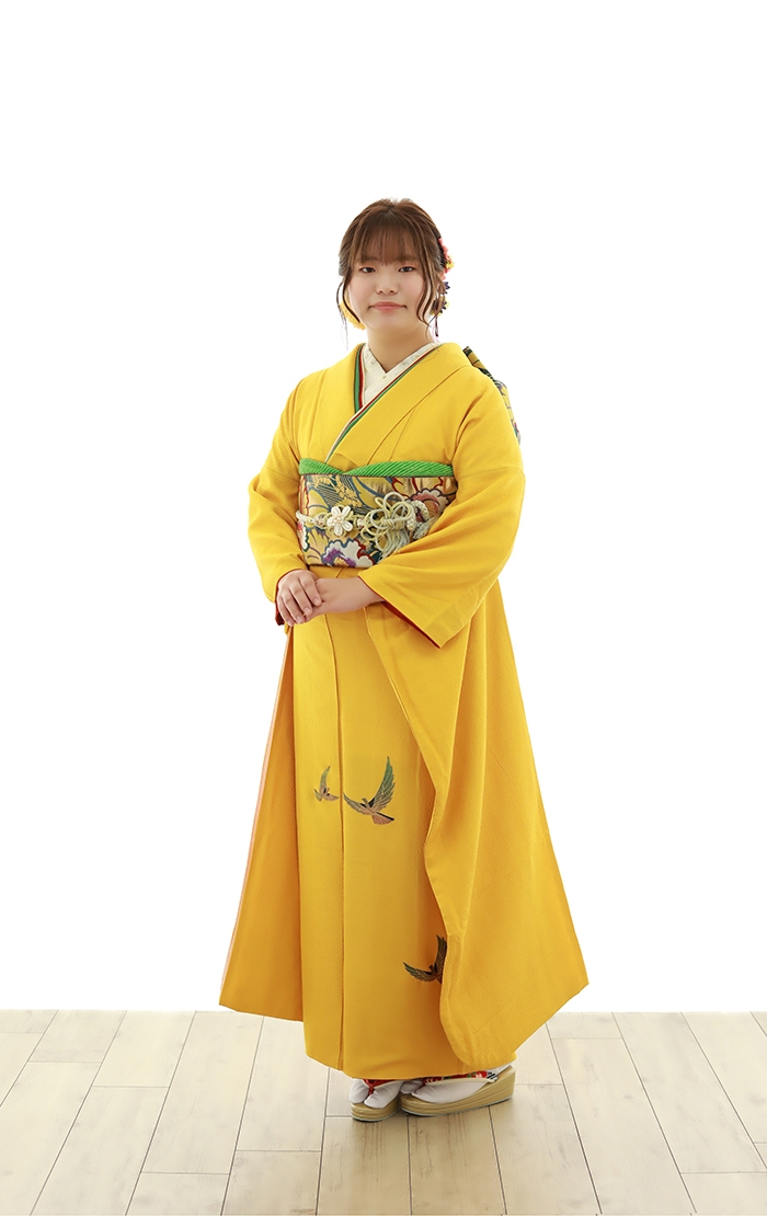 お母様が持っていたお振袖を今時風に着こなし、明るいお嬢様の雰囲気にイエローがとても似合いますね!